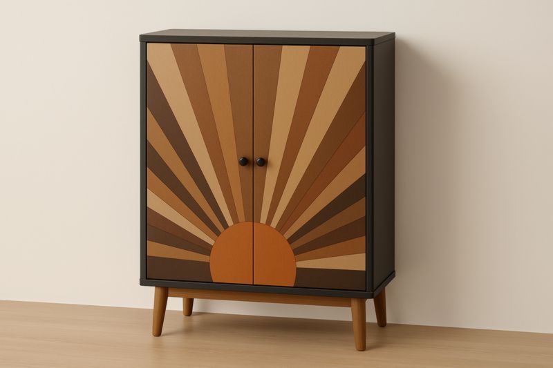 Matériau : Corps en MDF peint noir, portes en MDF à impression multicolore tons bruns, poignées en MDF peint noir, pieds en chêne massif verni.