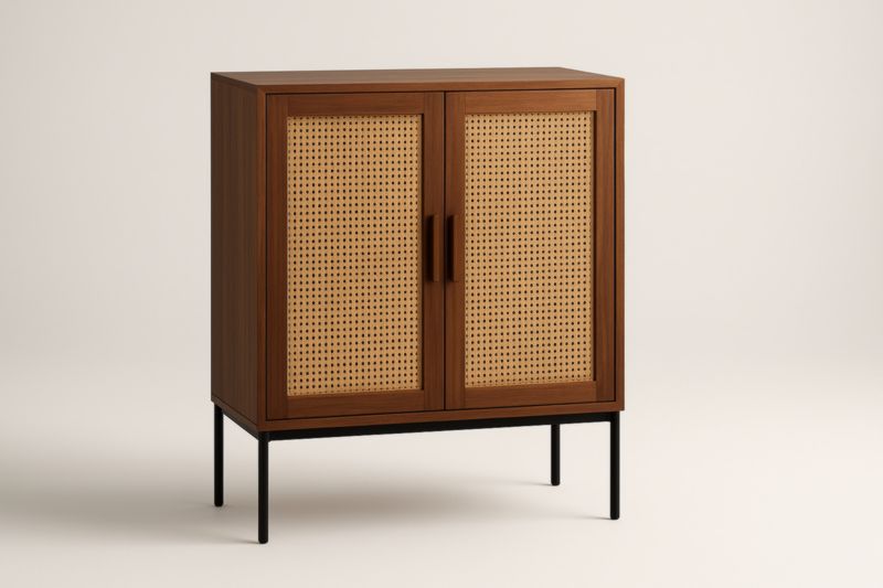 Armoire en MDF plaqué bois avec portes en rotin, poignées en MDF et pieds en acier noir. Les dimensions sont de 90 cm de hauteur, 80 cm de largeur et 40 cm de profondeur. Le poids total est de 15 kg. 2 portes battantes.